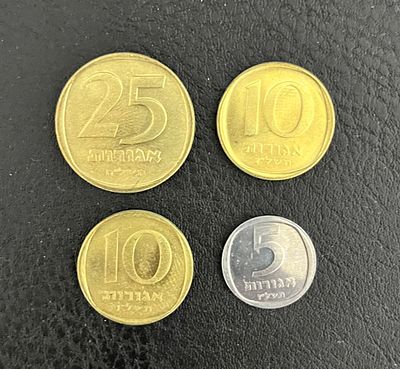 4 מטבעות ערכים שונים עם דמותם של הרצל/ז׳בוטינסקי/בן גוריון/רוטשילד.